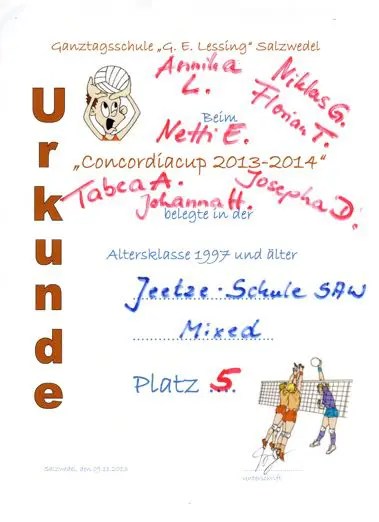 Wie man an den Urkunden erkennt, nahmen wir auch in diesem Jahr wieder erfolgreich am Concordia-Cup, ausgerichtet von der Lessing-Ganztagsschule, teil. Beide Mannschaften gaben ihr Bestes und hatten viel Spaß.